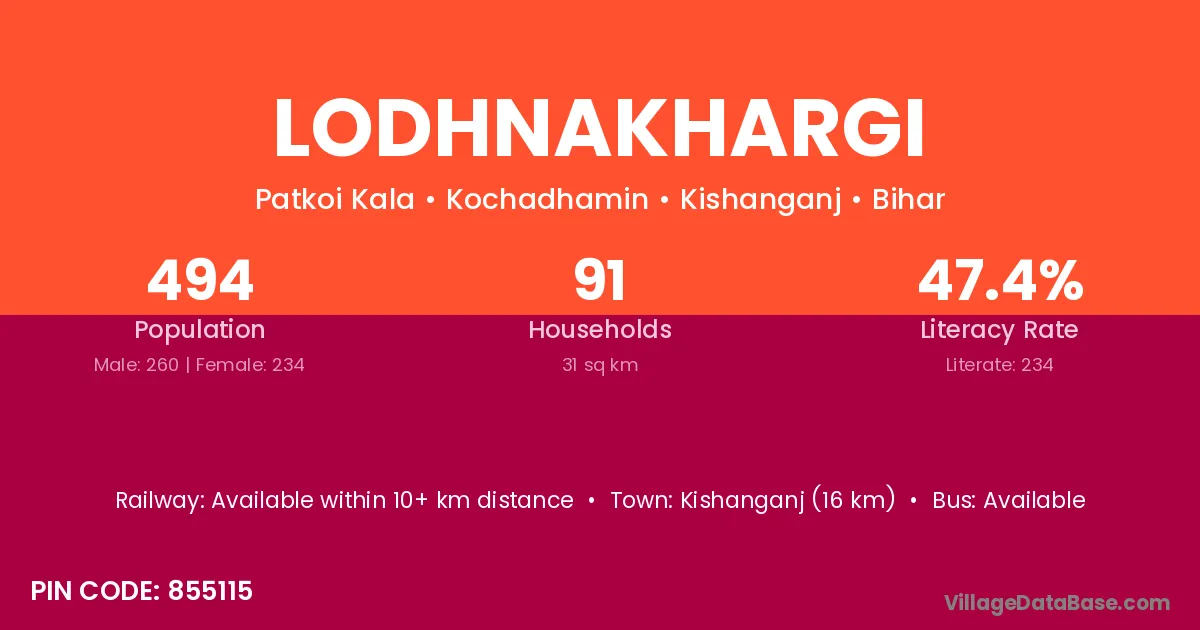 Kishanganj (16 km) is the nearest town to Lodhnakhargi village for major economic activities and is located approximately 16 km away.