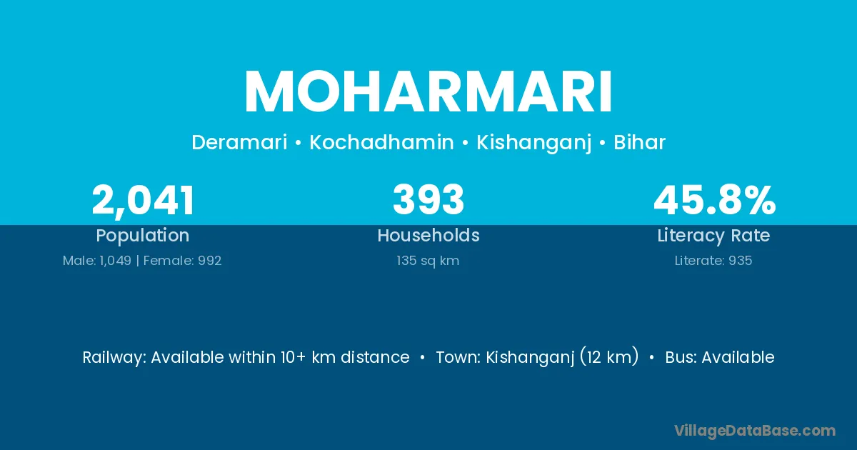 Kishanganj (12 km) is the nearest town to Moharmari village for major economic activities and is located approximately 12 km away.