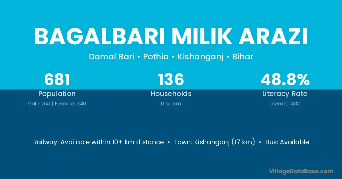 Kishanganj (17 km) is the nearest town to Bagalbari Milik Arazi village for major economic activities and is located approximately 17 km away.