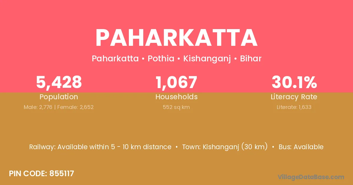 Kishanganj (30 km) is the nearest town to Paharkatta village for major economic activities and is located approximately 30 km away.