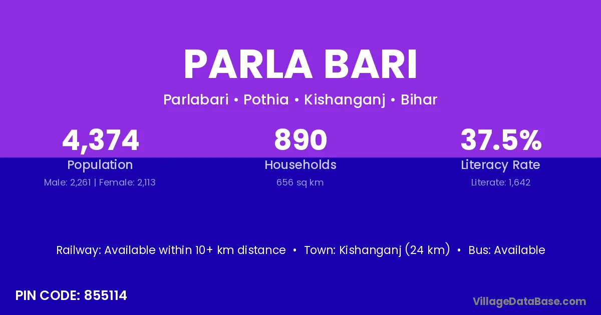 Kishanganj (24 km) is the nearest town to Parla Bari village for major economic activities and is located approximately 24 km away.