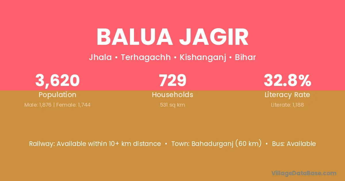 Bahadurganj (60 km) is the nearest town to Balua Jagir village for major economic activities and is located approximately 60 km away.