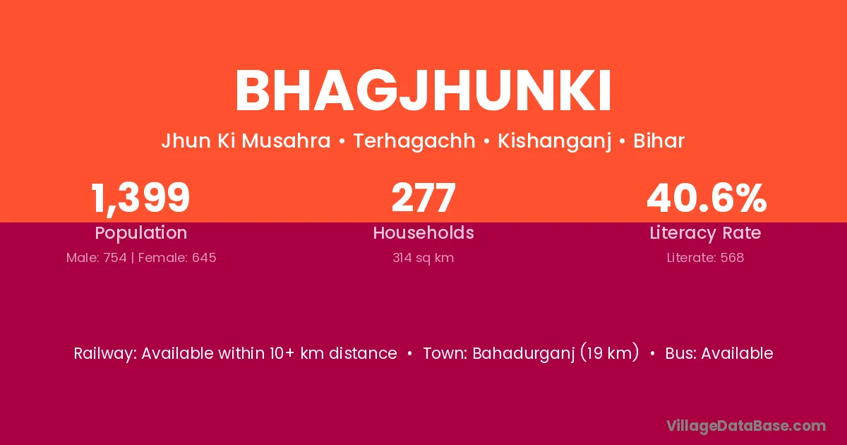 Bahadurganj (19 km) is the nearest town to Bhagjhunki village for major economic activities and is located approximately 19 km away.