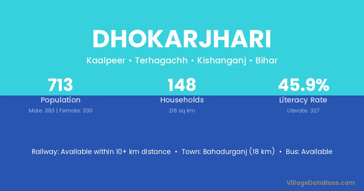 Bahadurganj (18 km) is the nearest town to Dhokarjhari village for major economic activities and is located approximately 18 km away.