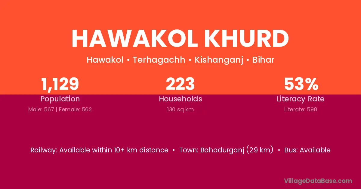 Bahadurganj (29 km) is the nearest town to Hawakol Khurd village for major economic activities and is located approximately 29 km away.