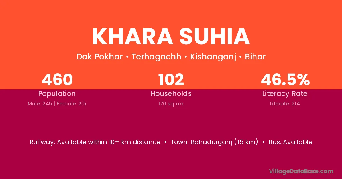 Bahadurganj (15 km) is the nearest town to Khara Suhia village for major economic activities and is located approximately 15 km away.