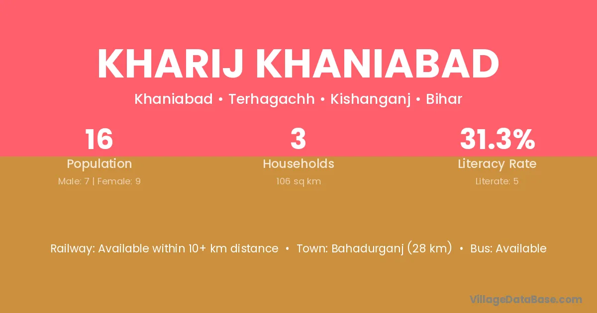 Kharij Khaniabad village has a total population of 16 people, of which 7 are males and 9 are females.