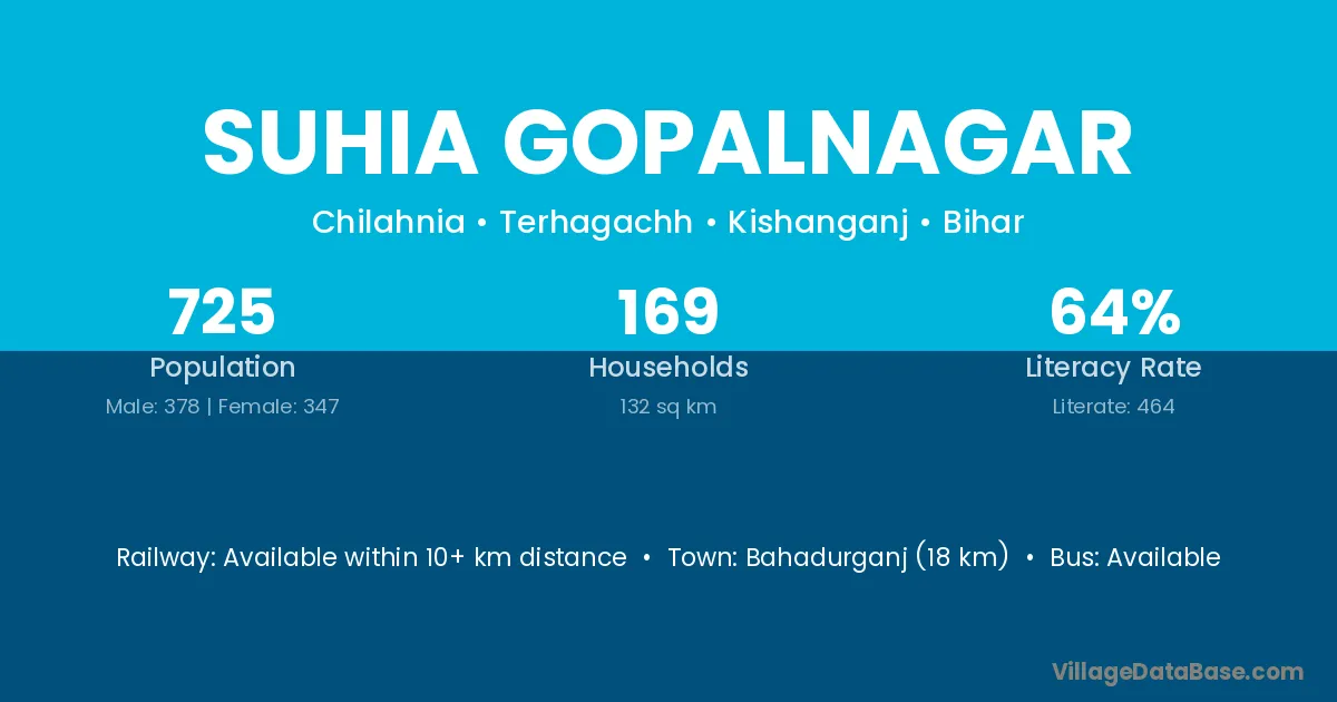 Bahadurganj (18 km) is the nearest town to Suhia Gopalnagar village for major economic activities and is located approximately 18 km away.