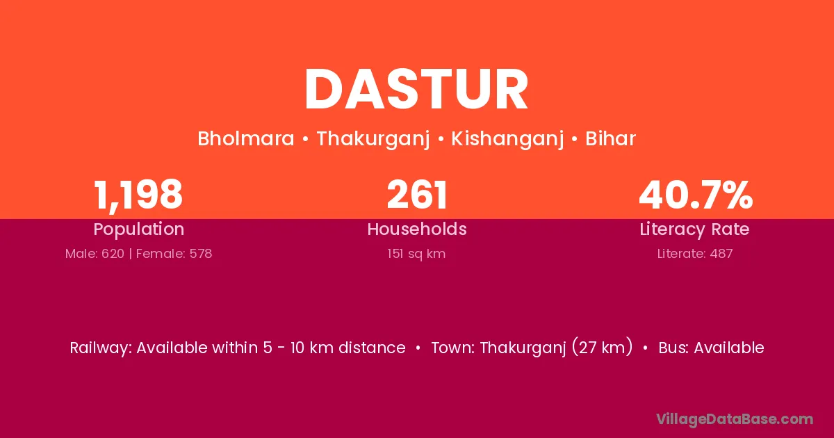 Thakurganj (27 km) is the nearest town to Dastur village for major economic activities and is located approximately 27 km away.