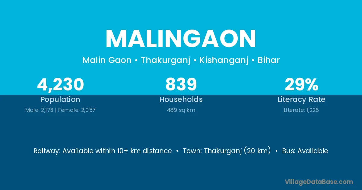 Thakurganj (20 km) is the nearest town to Malingaon village for major economic activities and is located approximately 20 km away.