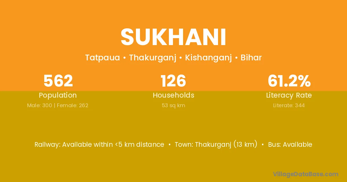 Thakurganj (13 km) is the nearest town to Sukhani village for major economic activities and is located approximately 13 km away.