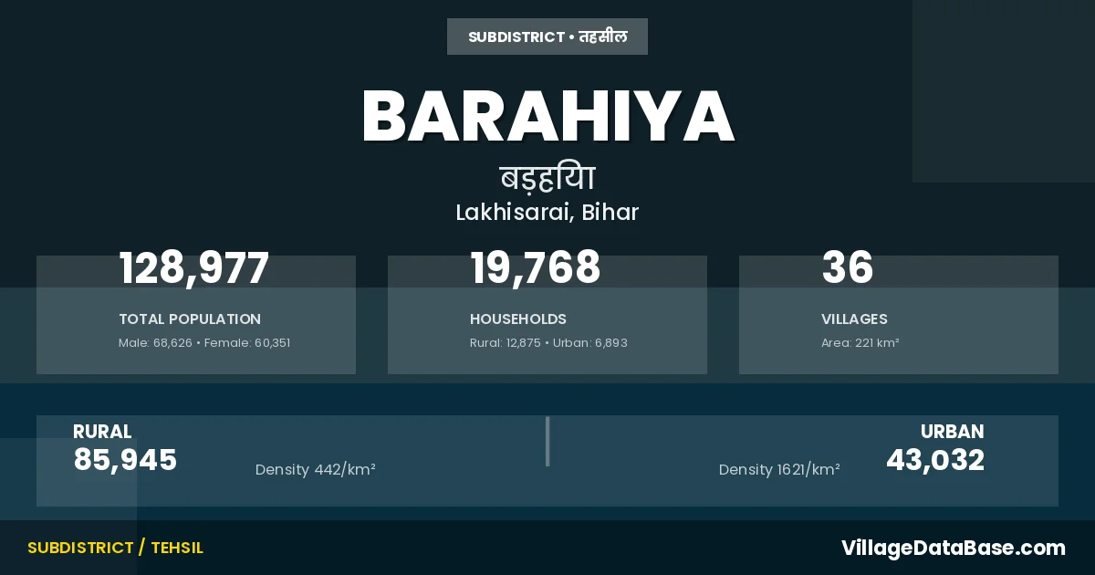 According to the 2011 census The total area of Barahiya Subdivision is 221 km², with a population of 128977 people. The population density is 584 inhabitants per square kilometre, and there are approximately 19768 houses in the sub district.