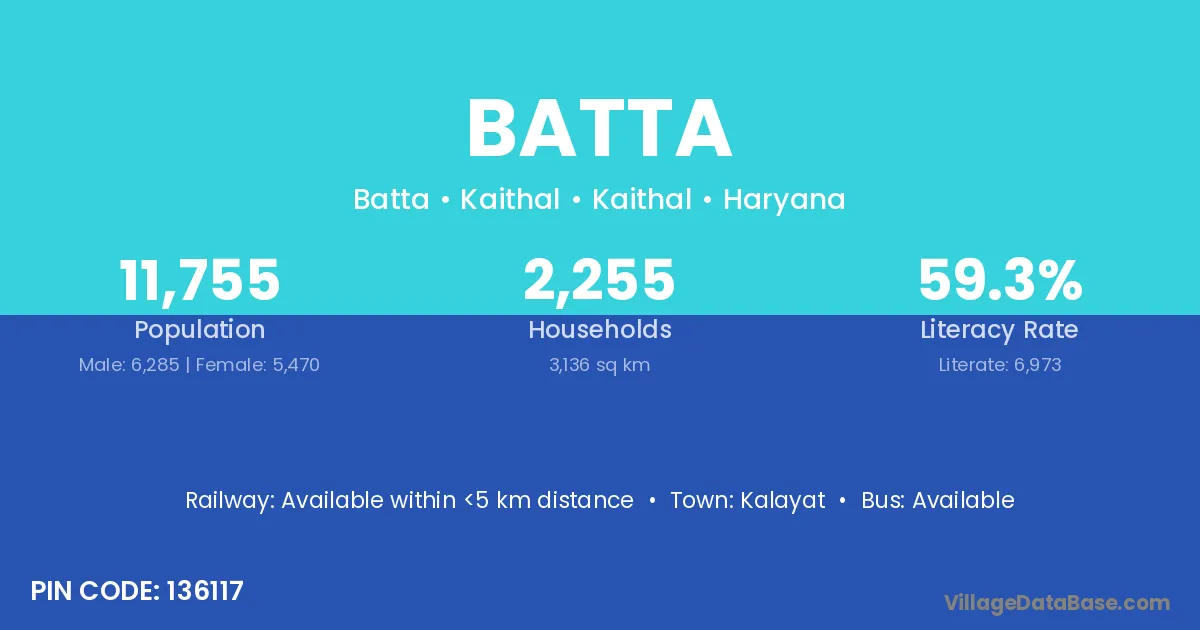 The literacy rate of Batta village is 51.67%. Male literacy stands at 61.97% and female literacy at 40.47%.