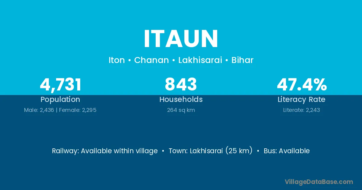 Lakhisarai (25 km) is the nearest town to Itaun village for major economic activities and is located approximately 25 km away.