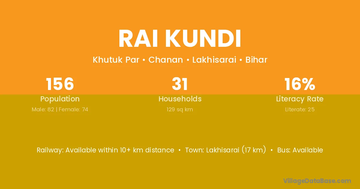 Lakhisarai (17 km) is the nearest town to Rai Kundi village for major economic activities and is located approximately 17 km away.