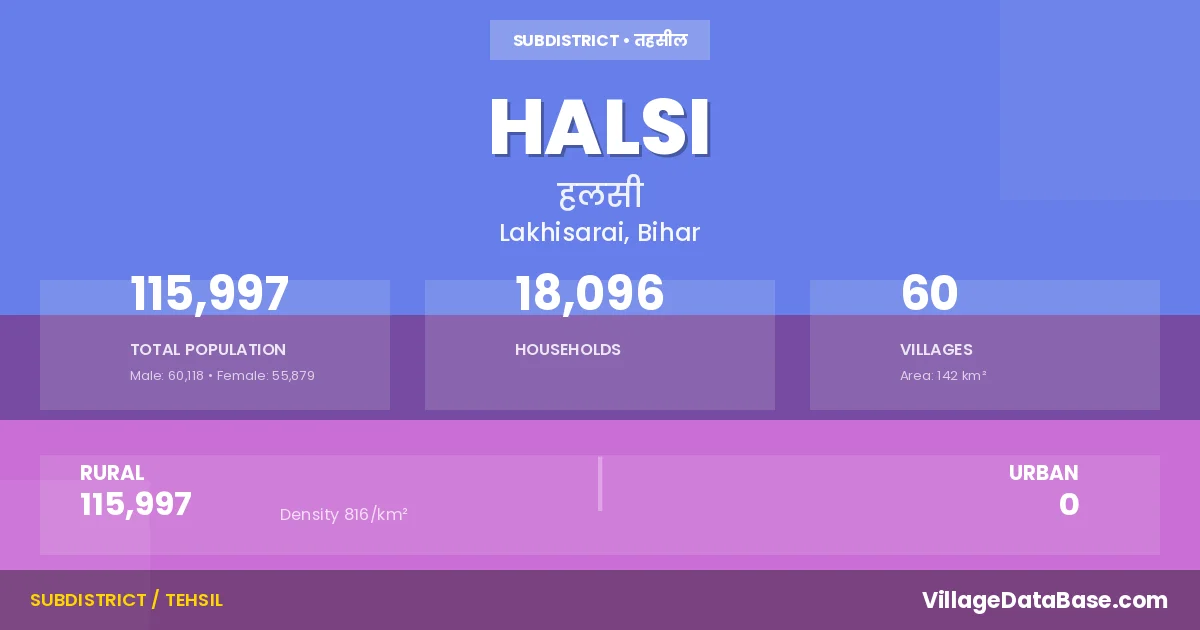 Halsi is a town and Subdivision in the Lakhisarai district of the Bihar. In India, a Subdivision is a subdivision of a district responsible for the administration and revenue collection of a specific area within the district. Subdivisions play a crucial role in the local governance structure, contributing significantly to the development and administration of their communities.
