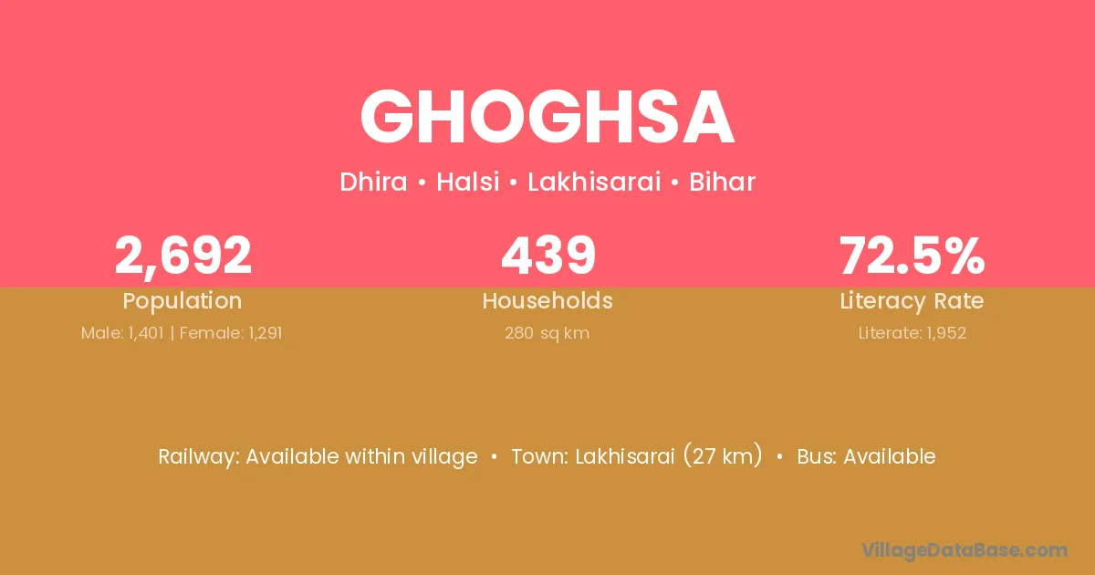 Lakhisarai (27 km) is the nearest town to Ghoghsa village for major economic activities and is located approximately 27 km away.