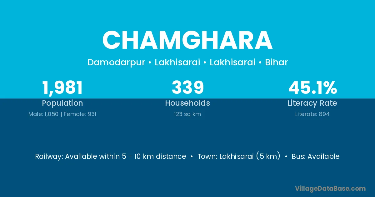 Lakhisarai (5 km) is the nearest town to Chamghara village for major economic activities and is located approximately 5 km away.