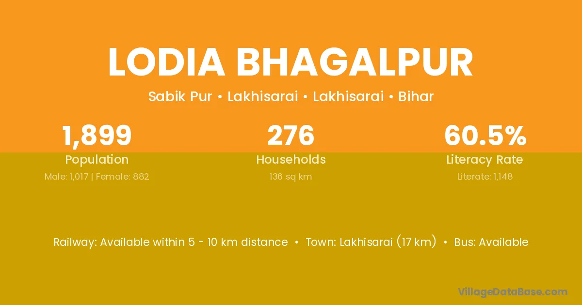Lakhisarai (17 km) is the nearest town to Lodia Bhagalpur village for major economic activities and is located approximately 17 km away.