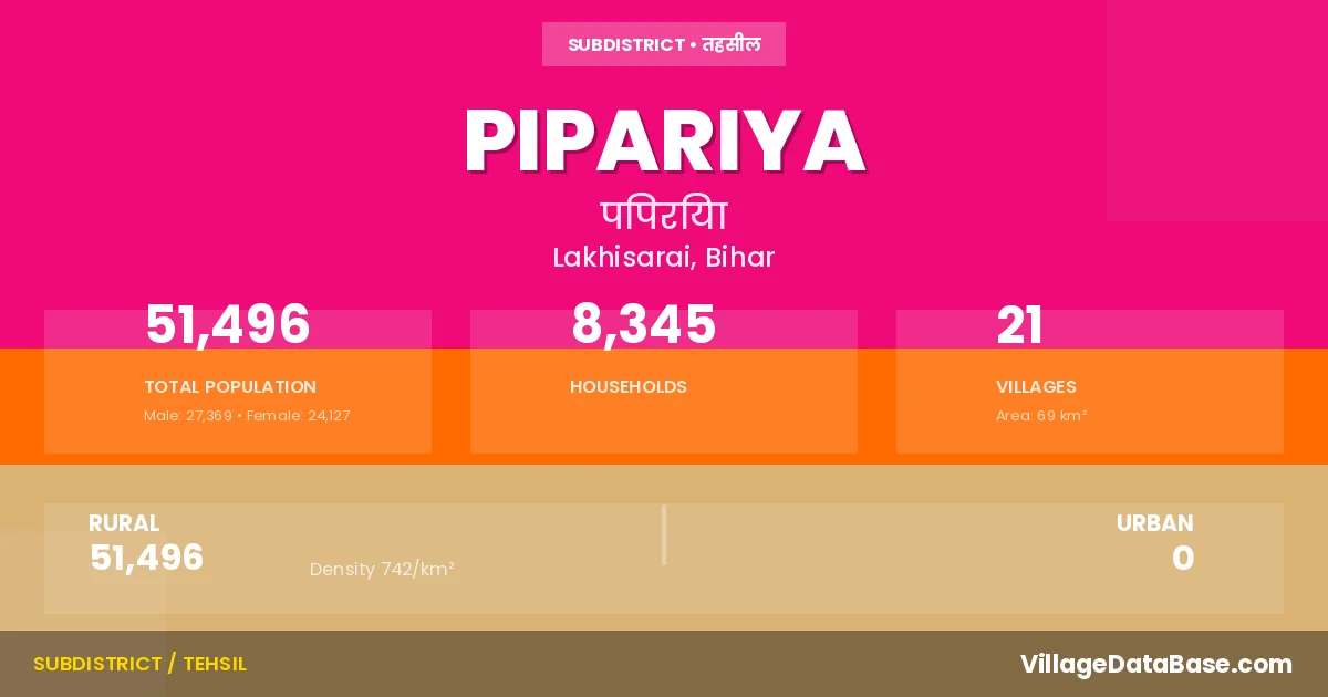 Pipariya is a town and Subdivision in the Lakhisarai district of the Bihar. In India, a Subdivision is a subdivision of a district responsible for the administration and revenue collection of a specific area within the district. Subdivisions play a crucial role in the local governance structure, contributing significantly to the development and administration of their communities.