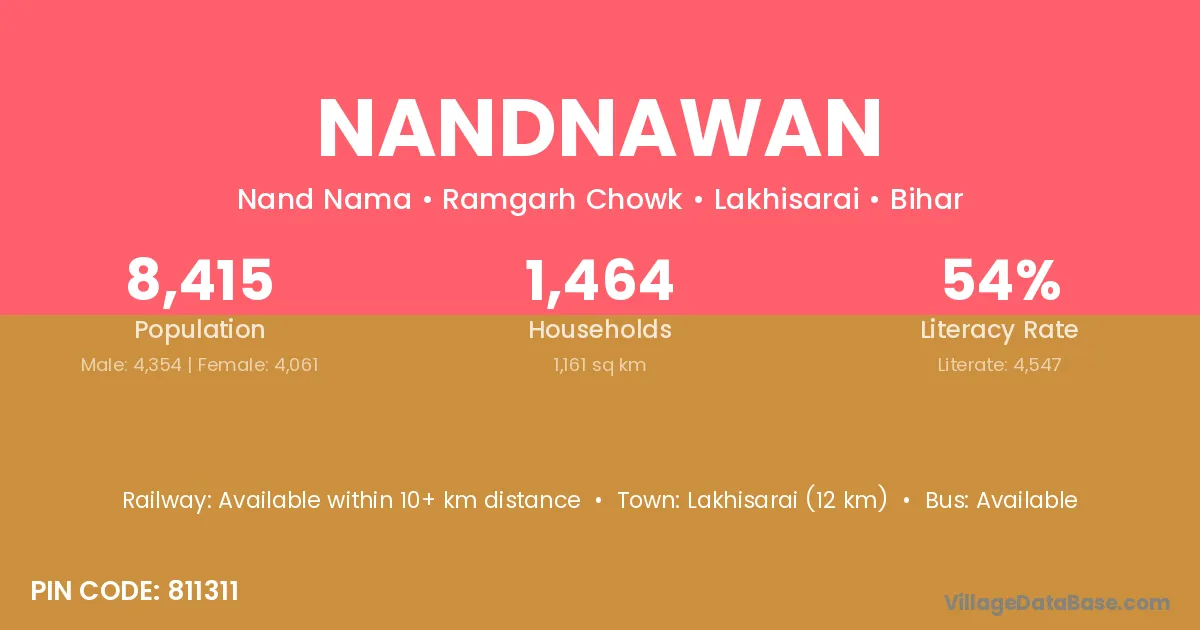 Lakhisarai (12 km) is the nearest town to Nandnawan village for major economic activities and is located approximately 12 km away.