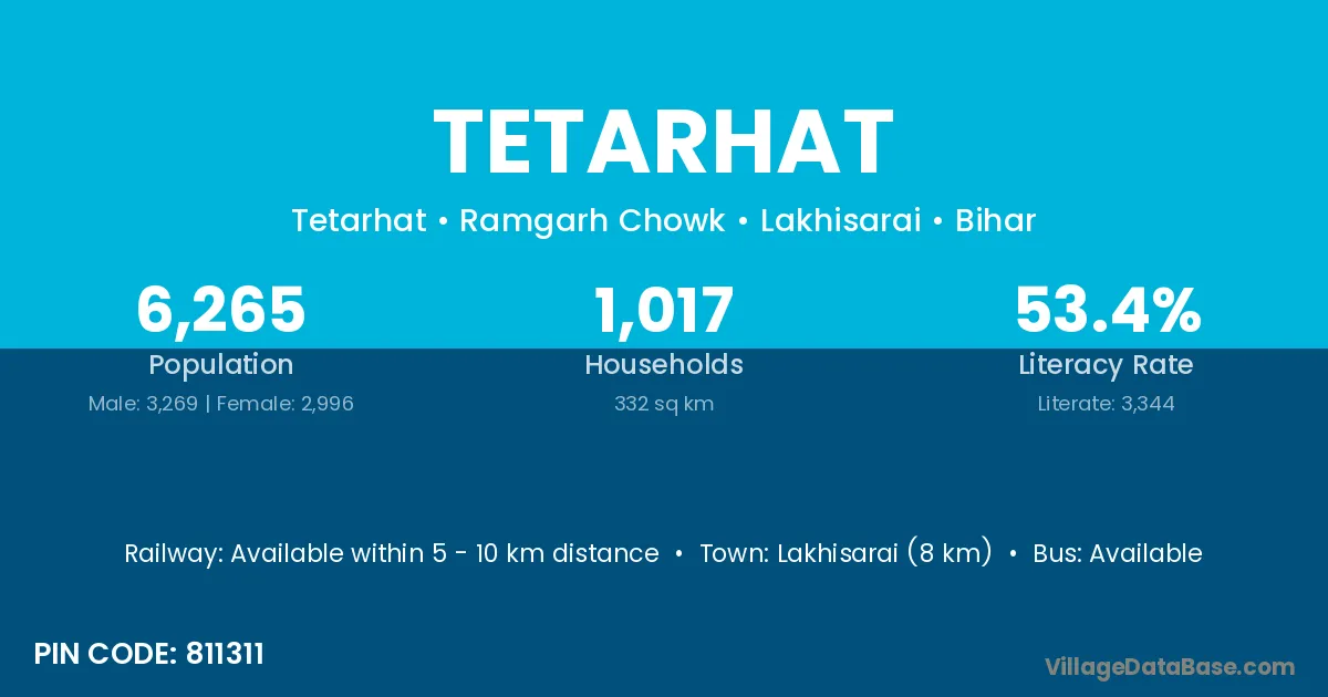 Lakhisarai (8 km) is the nearest town to Tetarhat village for major economic activities and is located approximately 8 km away.