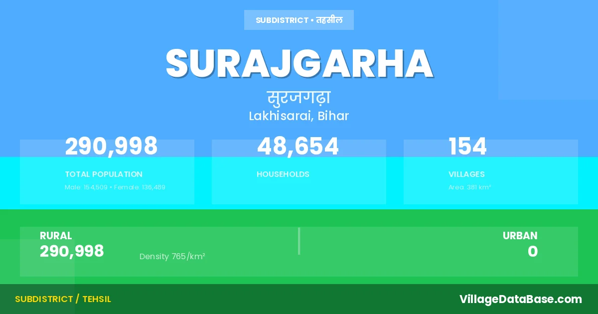 Surajgarha is a town and Subdivision in the Lakhisarai district of the Bihar. In India, a Subdivision is a subdivision of a district responsible for the administration and revenue collection of a specific area within the district. Subdivisions play a crucial role in the local governance structure, contributing significantly to the development and administration of their communities.