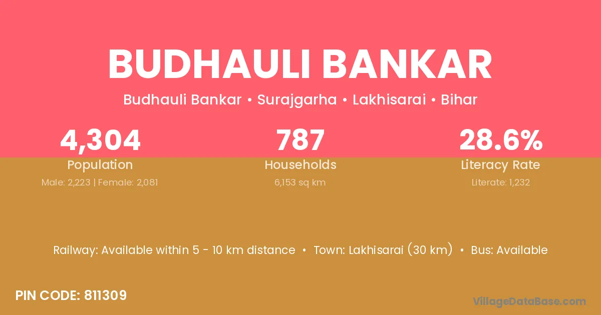 Lakhisarai (30 km) is the nearest town to Budhauli Bankar village for major economic activities and is located approximately 30 km away.
