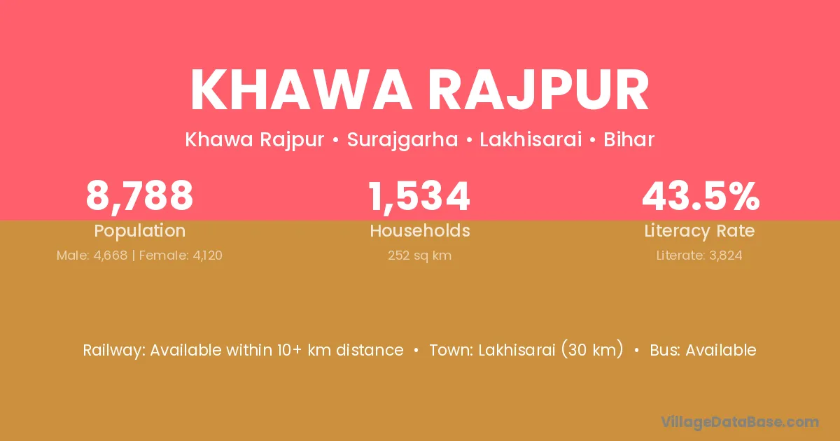 Lakhisarai (30 km) is the nearest town to Khawa Rajpur village for major economic activities and is located approximately 30 km away.