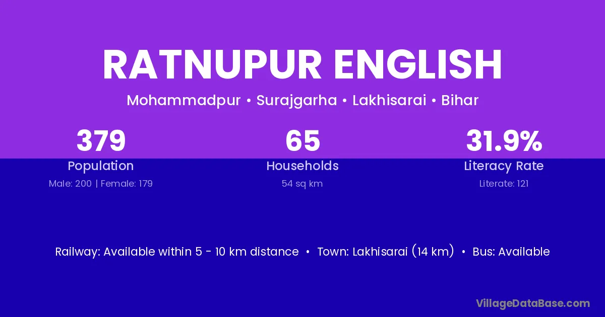 Lakhisarai (14 km) is the nearest town to Ratnupur English village for major economic activities and is located approximately 14 km away.