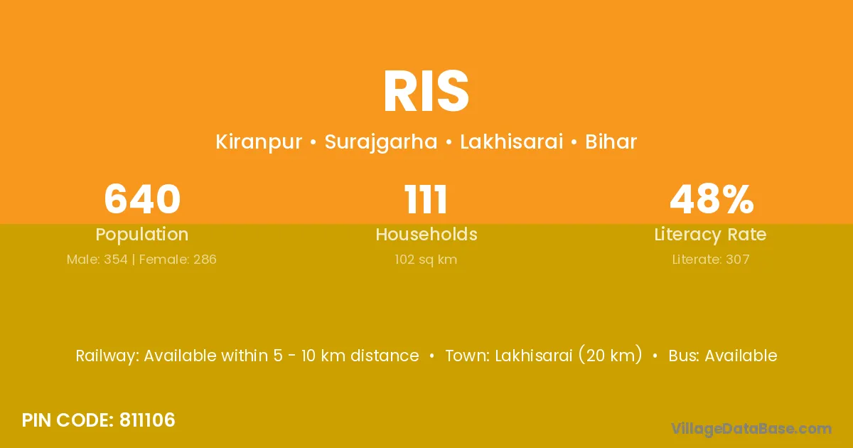 Lakhisarai (20 km) is the nearest town to Ris village for major economic activities and is located approximately 20 km away.