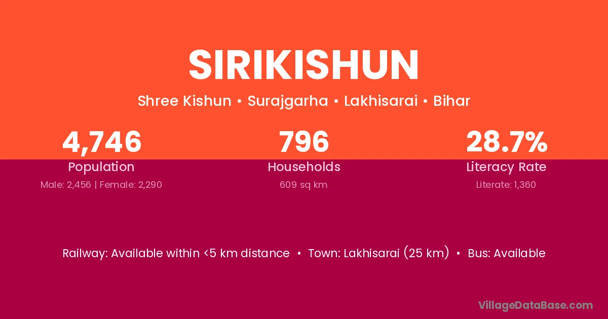 Lakhisarai (25 km) is the nearest town to Sirikishun village for major economic activities and is located approximately 25 km away.