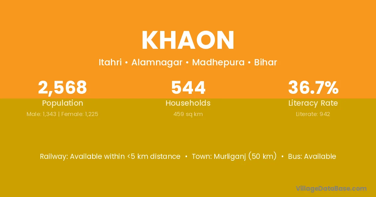 Murliganj (50 km) is the nearest town to Khaon village for major economic activities and is located approximately 50 km away.