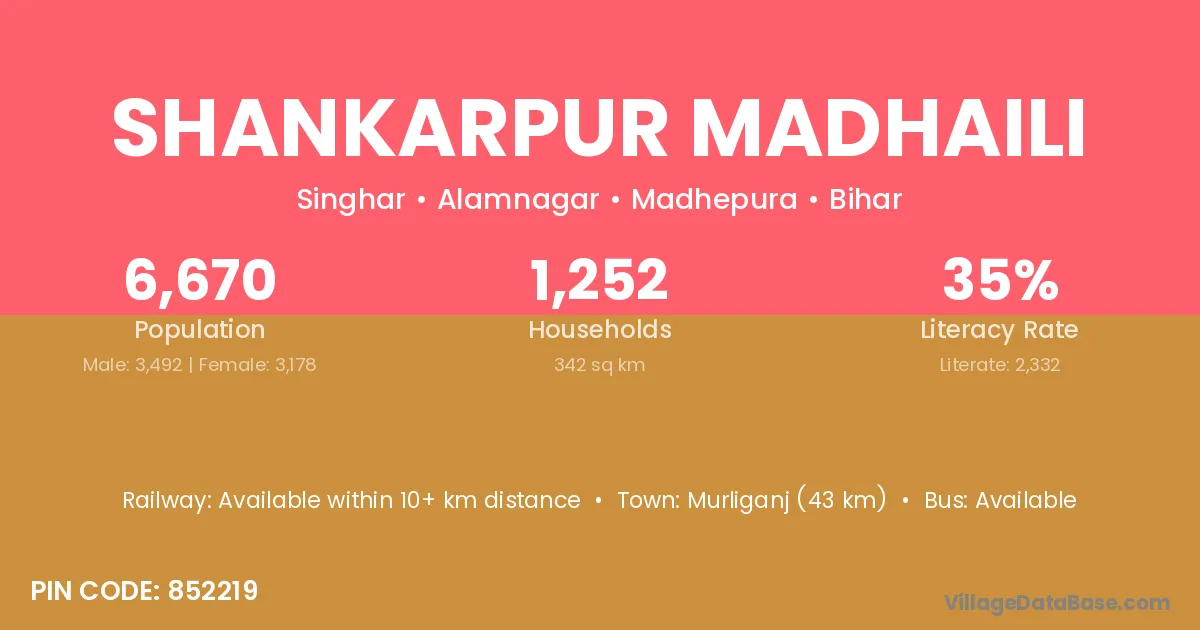 Murliganj (43 km) is the nearest town to Shankarpur Madhaili village for major economic activities and is located approximately 43 km away.