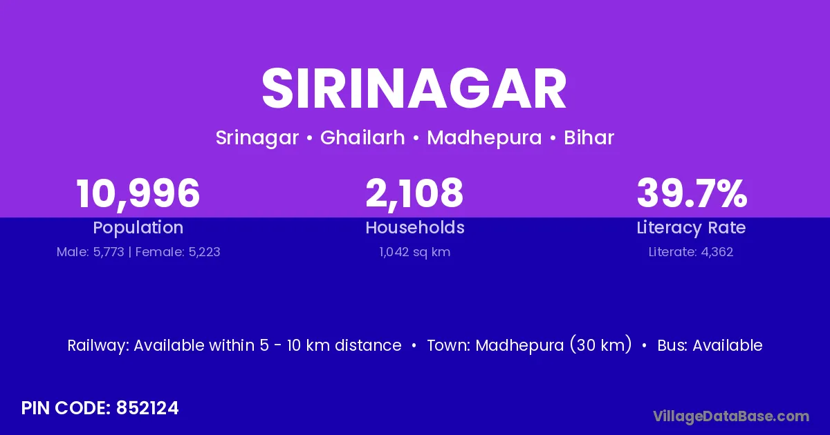 Madhepura (30 km) is the nearest town to Sirinagar village for major economic activities and is located approximately 30 km away.