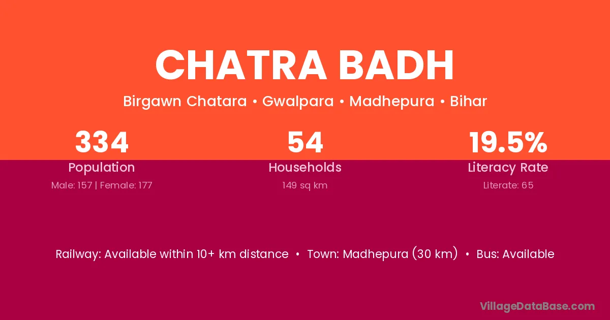 The literacy rate of Chatra Badh village is 19.46%. Male literacy stands at 28.66% and female literacy at 11.30%.