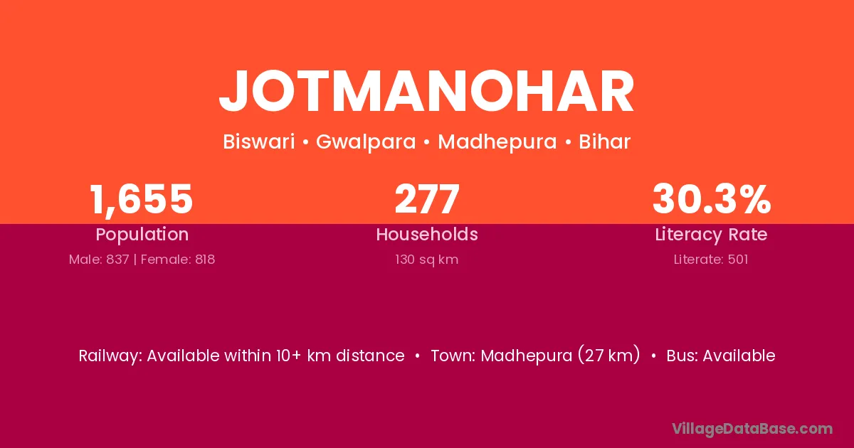Madhepura (27 km) is the nearest town to Jotmanohar village for major economic activities and is located approximately 27 km away.