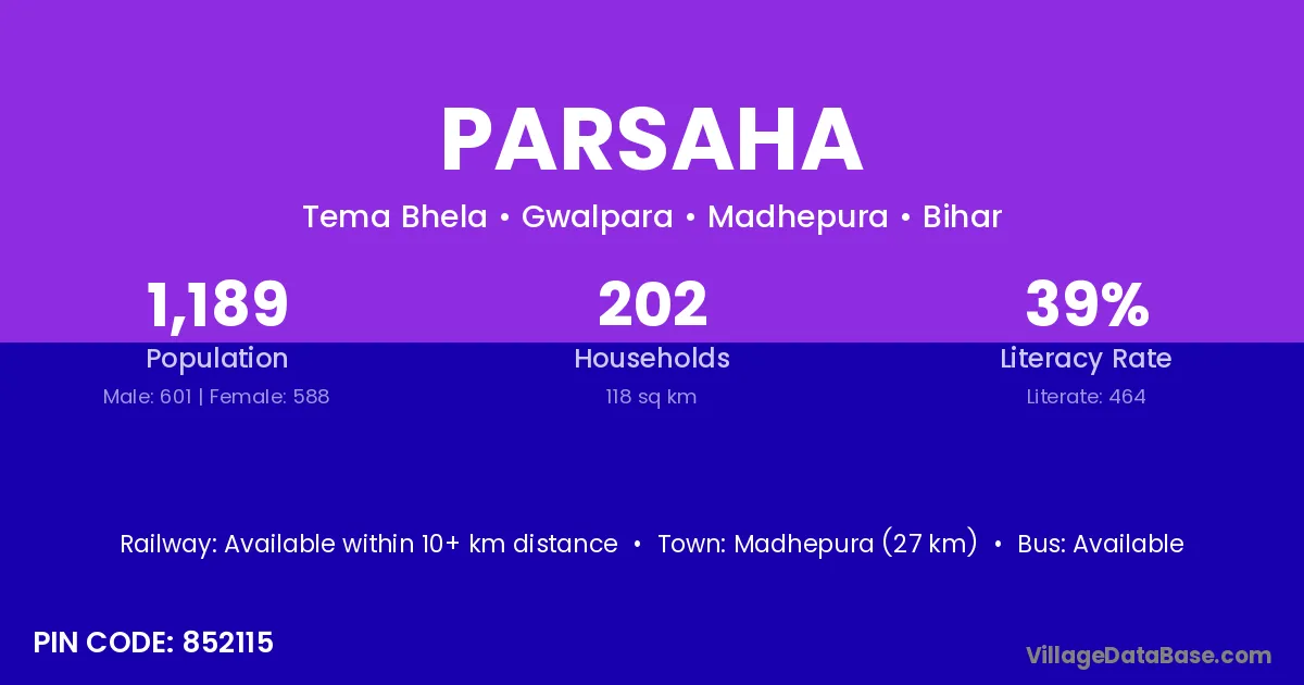 Madhepura (27 km) is the nearest town to Parsaha village for major economic activities and is located approximately 27 km away.