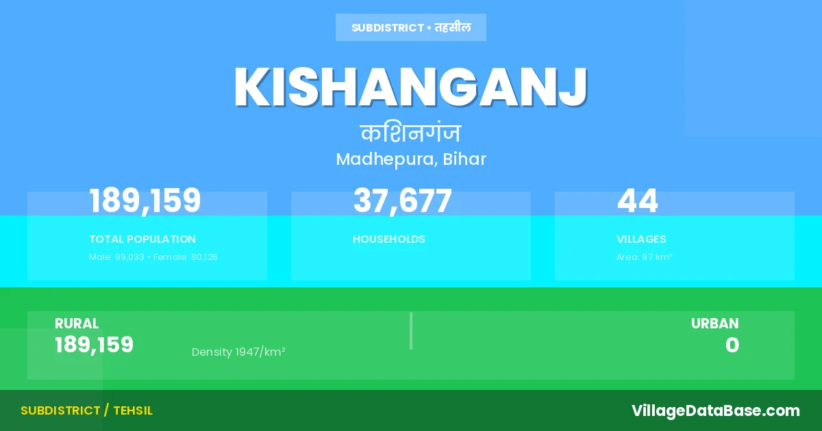 According to the 2011 census The total area of Kishanganj Subdivision is 97 km², with a population of 189159 people. The population density is 1,947 inhabitants per square kilometre, and there are approximately 37677 houses in the sub district.