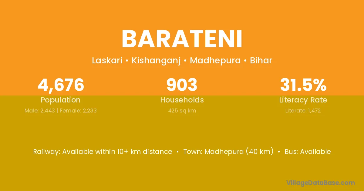 Madhepura (40 km) is the nearest town to Barateni village for major economic activities and is located approximately 40 km away.