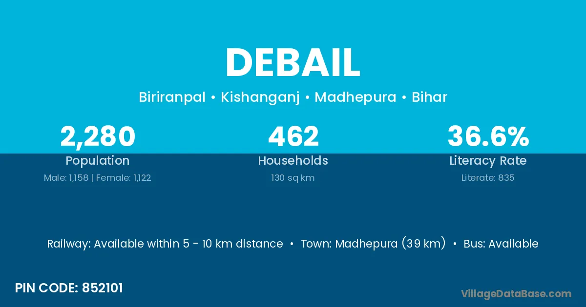 Madhepura (39 km) is the nearest town to Debail village for major economic activities and is located approximately 39 km away.