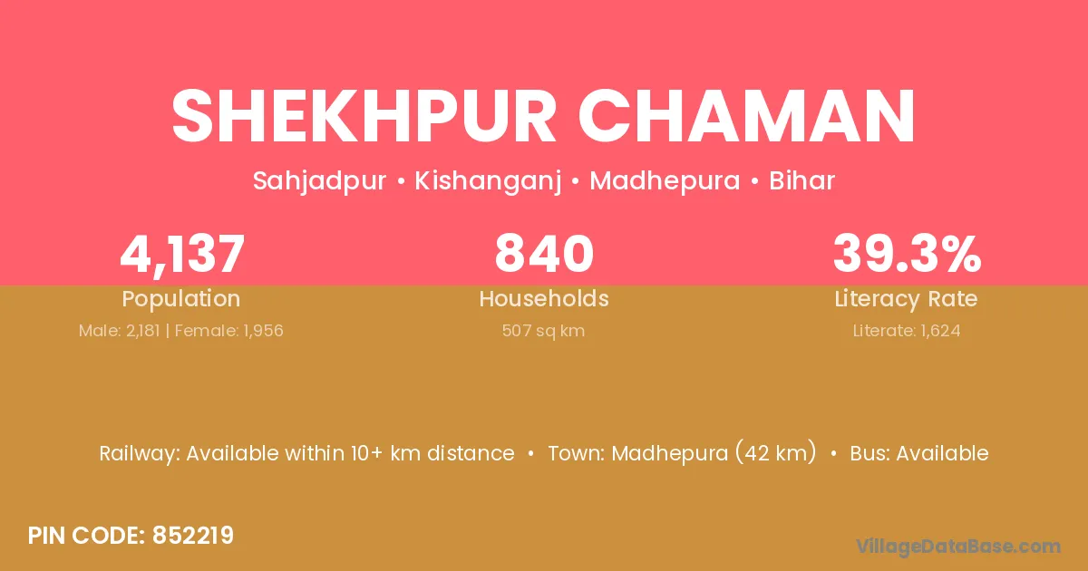 Madhepura (42 km) is the nearest town to Shekhpur Chaman village for major economic activities and is located approximately 42 km away.