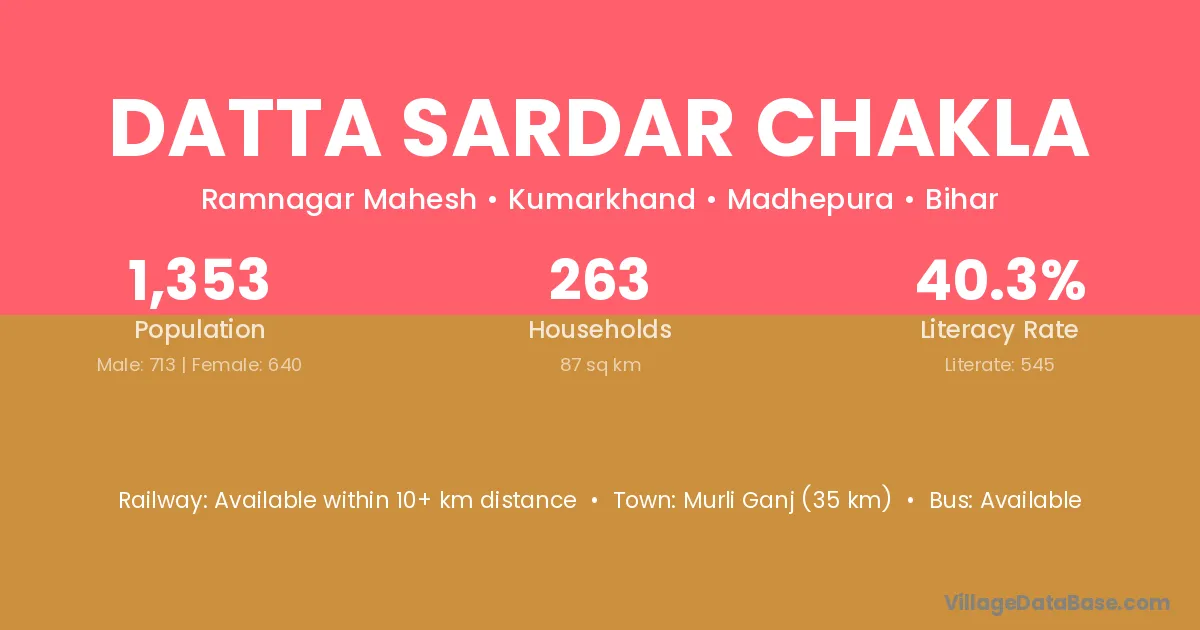 Datta Sardar Chakla village has a total population of 1,353 people, of which 713 are males and 640 are females.