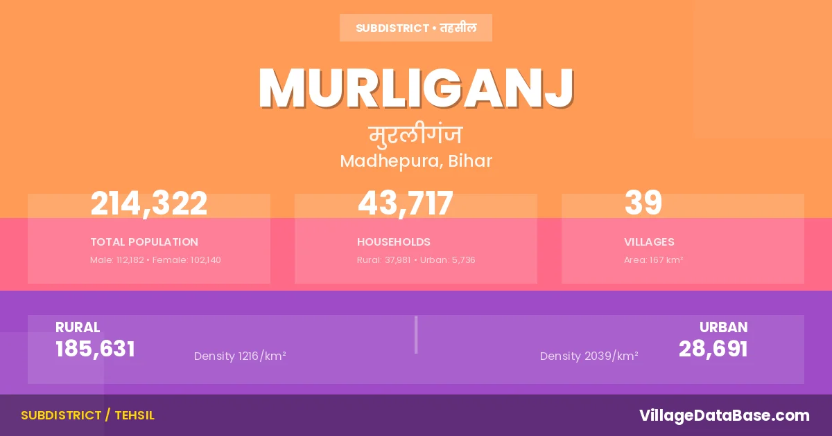 According to the 2011 census The total area of Murliganj Subdivision is 167 km², with a population of 214322 people. The population density is 1,285 inhabitants per square kilometre, and there are approximately 43717 houses in the sub district.