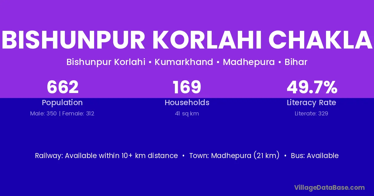Bishunpur Korlahi Chakla village is located in the Murliganj Subdivision of the Madhepura district in Bihar .