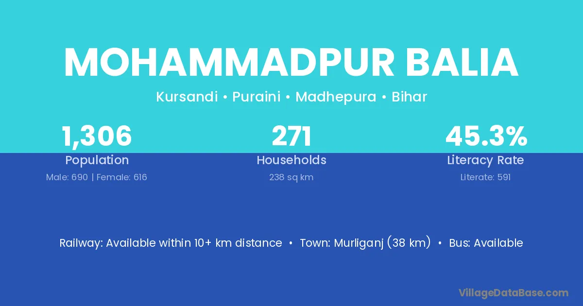 Murliganj (38 km) is the nearest town to Mohammadpur Balia village for major economic activities and is located approximately 38 km away.