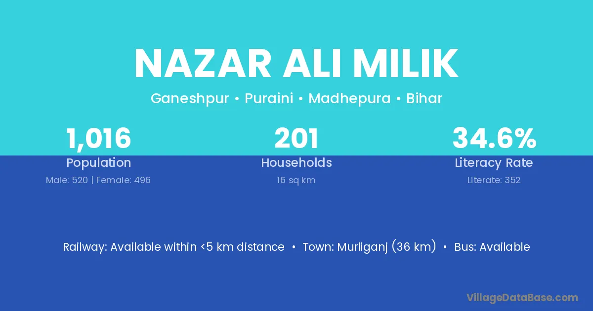 Murliganj (36 km) is the nearest town to Nazar Ali Milik village for major economic activities and is located approximately 36 km away.
