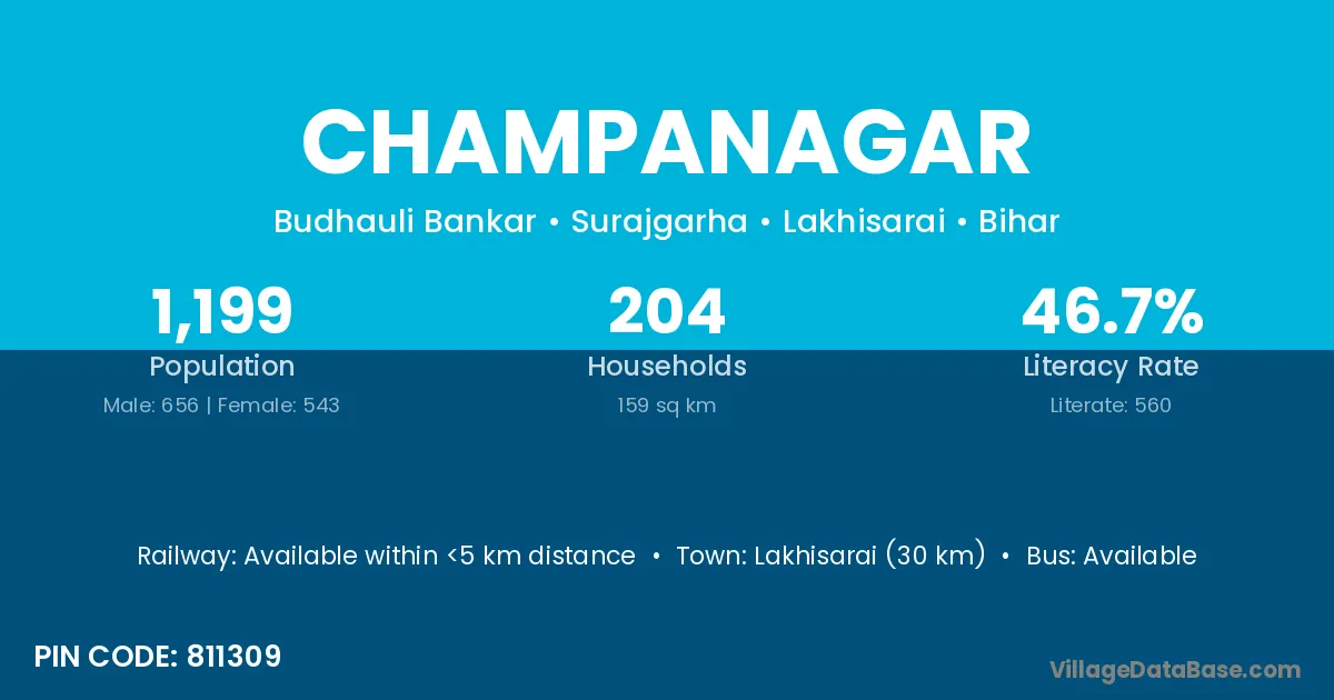 The literacy rate of Champanagar village is 43.19%. Male literacy stands at 56.53% and female literacy at 29.28%.