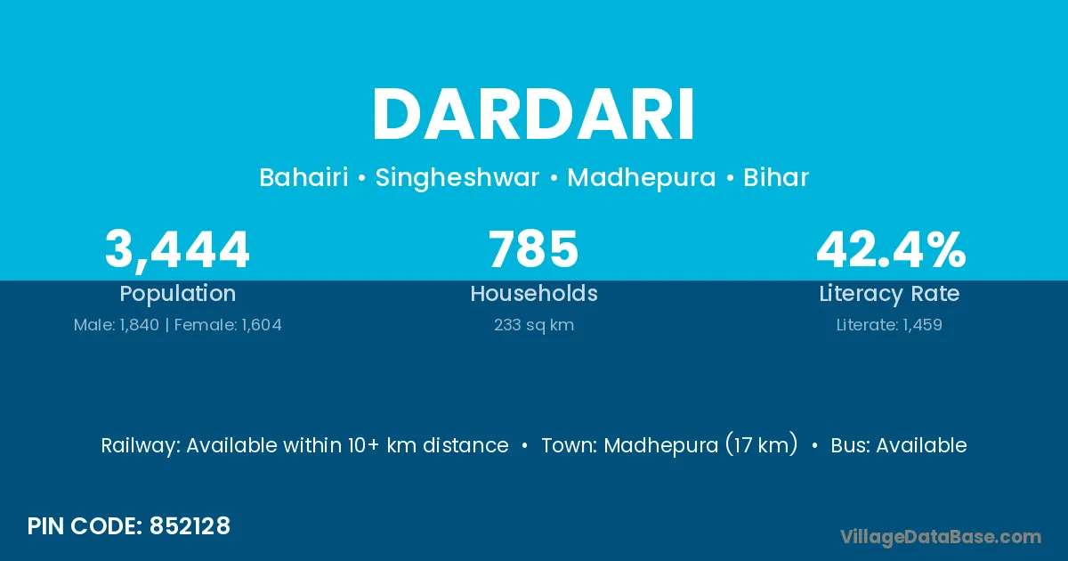 Madhepura (17 km) is the nearest town to Dardari village for major economic activities and is located approximately 17 km away.