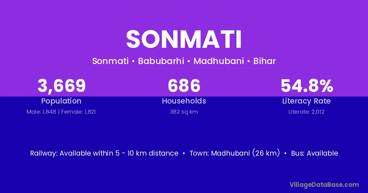 Madhubani (26 km) is the nearest town to Sonmati village for major economic activities and is located approximately 26 km away.